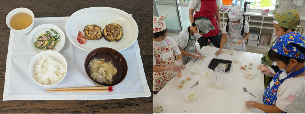 年長さんでは 〈白飯、ナスの肉詰め、ピーマンのツナ和え、ふわふわたまごスープ〉を作りました。