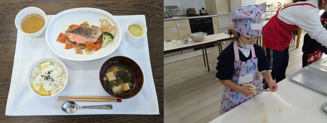 11月のキッチン・ラボでは、『旬の味』をテーマに、秋ならではの食材や、園で収穫したさつまいもやほうれん草を使った料理を味わいました。🍠